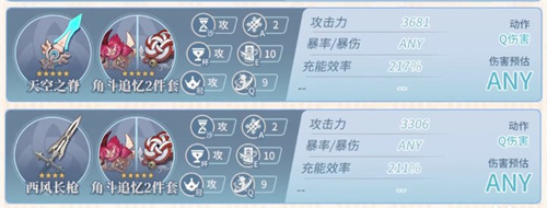 当申鹤使用【西风长枪】带“角斗士两件套”+“追忆两件套”时,毕业条件为: